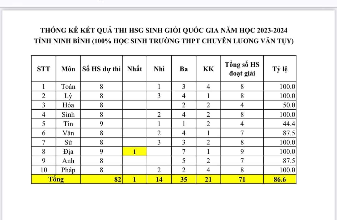 Kỳ thi chọn học sinh giỏi Quốc gia năm học 2023-2024 vừa được tổ chức đầu tháng 1/2024. Tham dự kỳ thi, tỉnh Ninh Bình có 82 học sinh dự thi ở 10 đội tuyển (Toán, Tin, Lý, Hóa, Sinh, Ngữ văn, Lịch sử, Địa lý, Tiếng Anh, Tiếng Pháp), đều là học sinh Trường THPT chuyên Lương Văn Tụy.