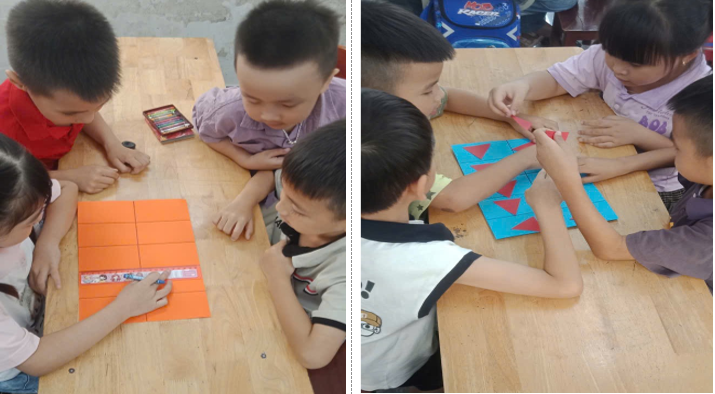 Ngay từ đầu tiết học, không khí lớp 1C đã tràn đầy hào hứng. Các em lắng nghe cô giáo giới thiệu mục tiêu hoạt động, sau đó bắt tay vào việc chuẩn bị nguyên liệu: giấy bìa, hồ dán, hộp màu, bút chì, thước kẻ… Mỗi em, mỗi nhóm đều say sưa sáng tạo, trang trí để tạo nên chiếc khay 10 mang dấu ấn riêng. Từng phép cộng, phép tách số được minh họa bằng những hình tam giác màu sắc xinh xắn, được sắp xếp cẩn thận vào từng ô trên khay. Các em vui thích phát hiện ra rằng có rất nhiều cặp số khác nhau có thể cùng tạo thành số 10.