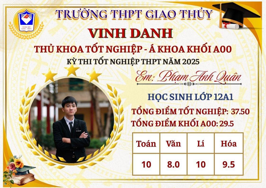 Trao đổi với Báo Giáo dục và Thời đại, nhà giáo Lê Thanh Giang – Hiệu trưởng Trường THPT Giao Thủy (tỉnh Ninh Bình) cho hay, kết quả thi tốt nghiệp THPT năm 2025 của học sinh nhà trường đạt những bước tiến mới đáng khích lệ, nhiều thí sinh giành điểm cao khẳng định chất lượng dạy và học của thầy trò nhà trường.