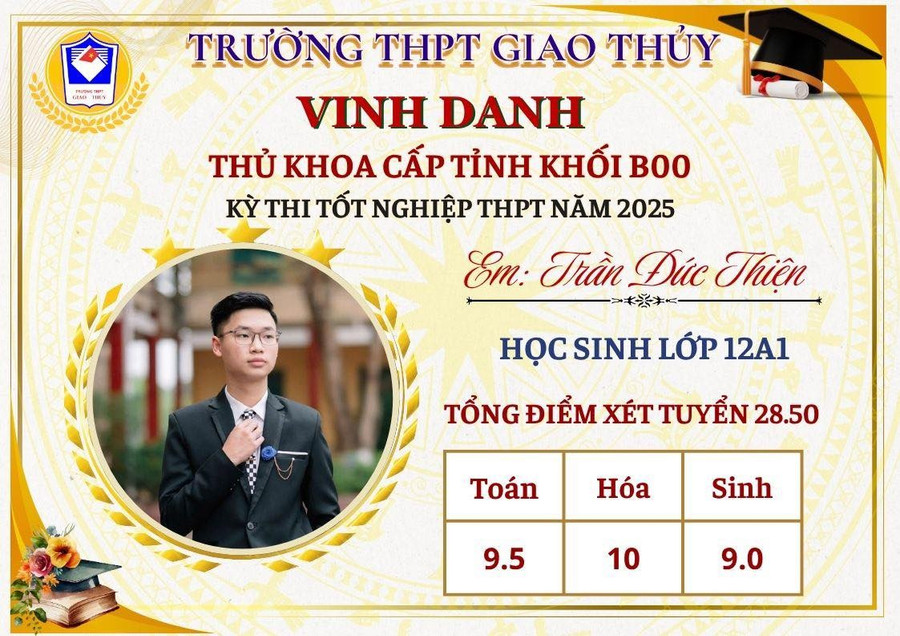 “Những kết quả trên không chỉ là thành tích cá nhân xuất sắc mà còn là minh chứng cho sự đồng hành tận tụy từ các thầy cô, sự chăm lo từ phụ huynh, và tinh thần nỗ lực không ngừng nghỉ của các em học sinh để viết tiếp những trang vàng thành tích của nhà trường” – Hiệu trưởng Trường THPT Giao Thủy Lê Thanh Giang nhấn mạnh.