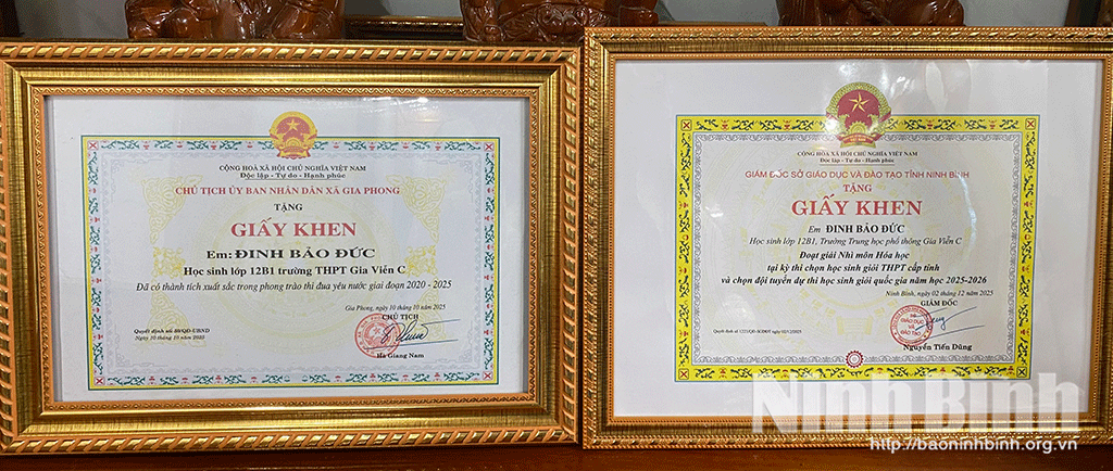 Em Đinh Bảo Đức, học sinh lớp 12B1, Trường THPT Gia Viễn C có niềm đam mê đặc biệt với môn Hoá học.Nhắc đến em Đinh Bảo Đức, nhiều người không khỏi khâm phục nghị lực của em trong cuộc sống cũng như trong học tập. Từ khi còn bé, Đức đã phải chịu nhiều thiệt thòi hơn các bạn cùng trang lứa. Mẹ mất vì bệnh hiểm nghèo khi em học lớp 5, khiến em xa rời vòng tay yêu thương, chăm sóc của mẹ. Bố phải lo làm ăn xa, hoàn cảnh gia đình không cho phép, Đức và em trai đã chuyển về nhà bác ruột ở xã Gia Phong và tiếp tục chương trình học tập. Tại vùng quê nông thôn, điều kiện học tập còn nhiều khó khăn, nhưng chính nơi đây đã trở thành cái nôi ươm mầm cho những ước mơ của cậu học trò nhỏ.