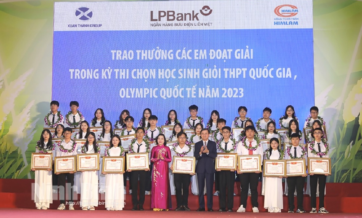 Đồng chí Nguyễn Thị Thanh, Ủy viên Ban chấp hành Trung ương Đảng, Ủy viên Đảng đoàn Quốc hội, Phó Chủ tịch Quốc hội, Phó Chủ tịch Nhóm nữ Đại biểu Quốc hội Việt Nam, Chủ tịch Hội Hữu nghị Việt Nam – Campuchia và đồng chí Đoàn Minh Huấn, Ủy viên Ban Chấp hành Trung ương Đảng, Bí thư Tỉnh ủy trao thưởng cho các em học sinh đoạt giải trong kỳ thi chọn học sinh giỏi quốc gia, quốc tế năm 2023