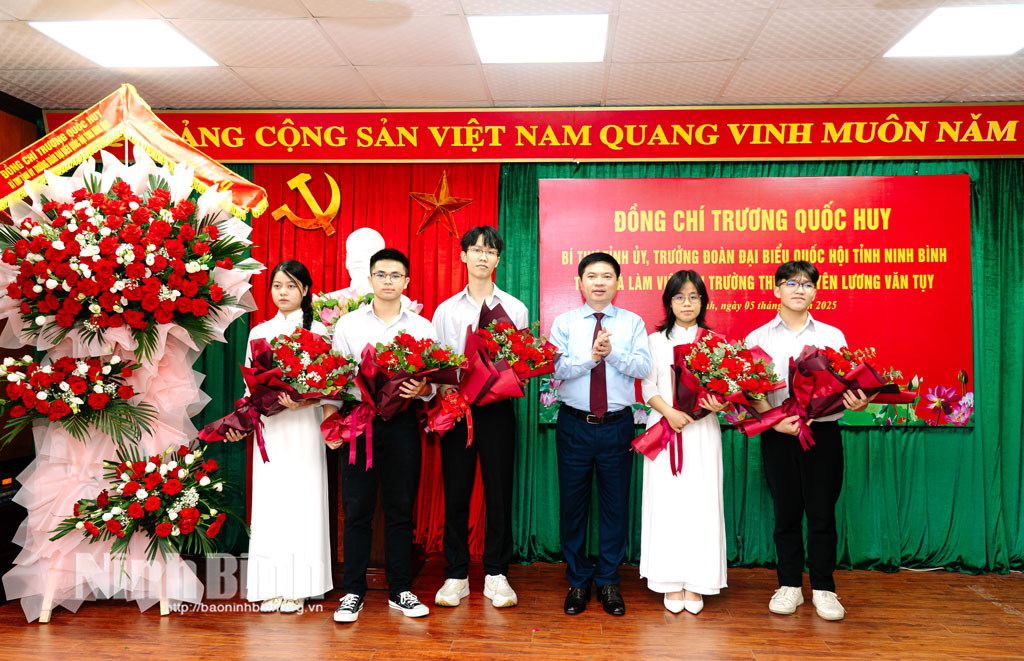 Nhân dịp về thăm và làm việc với thầy và trò Trường THPT chuyên Lương Văn Tụy, đồng chí Bí thư Tỉnh ủy Trương Quốc Huy đã tặng hoa chúc mừng khai giảng năm học mới nhà trường và tặng quà cho đại diện các thầy, cô giáo phụ trách các đội tuyển học sinh giỏi năm học 2024 – 2025 cùng các học sinh đạt các giải cao trong kỳ thi chọn học sinh giỏi quốc gia và cấp tỉnh.