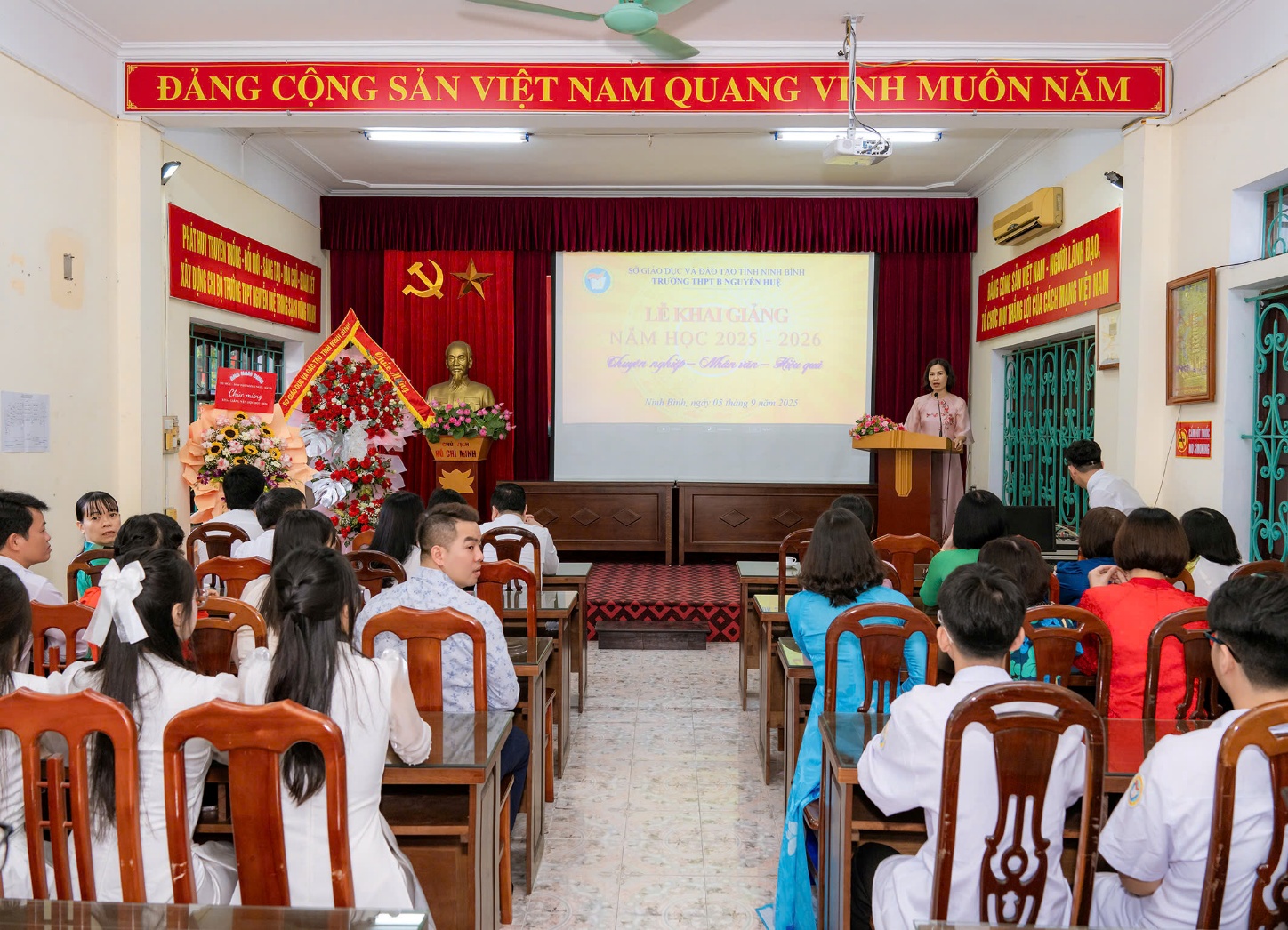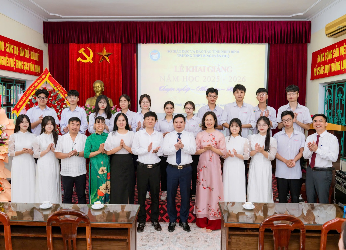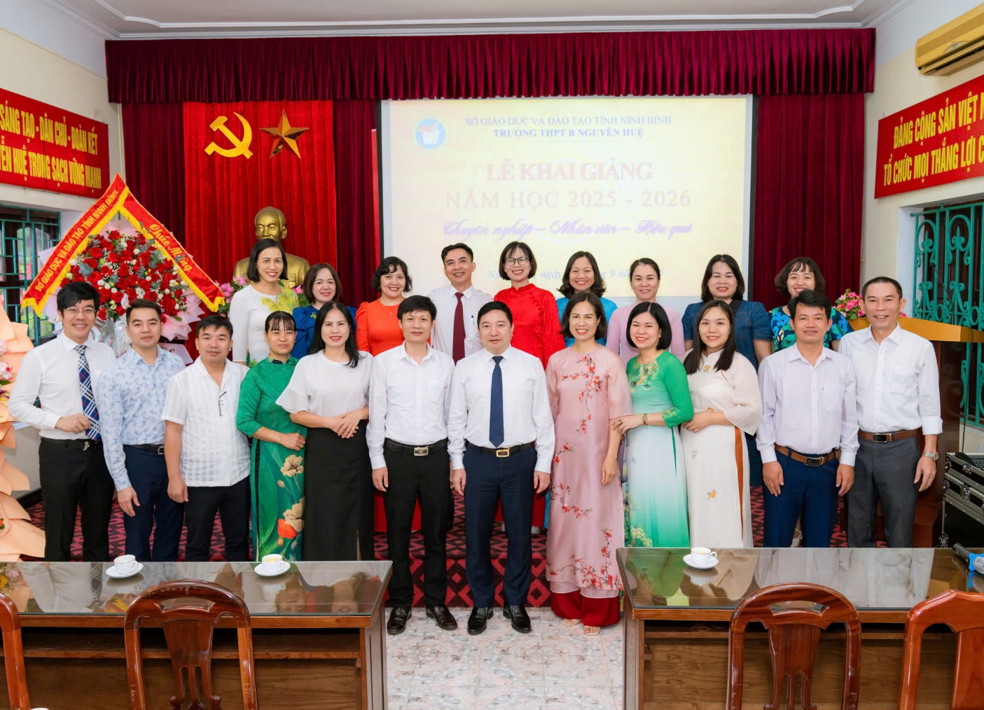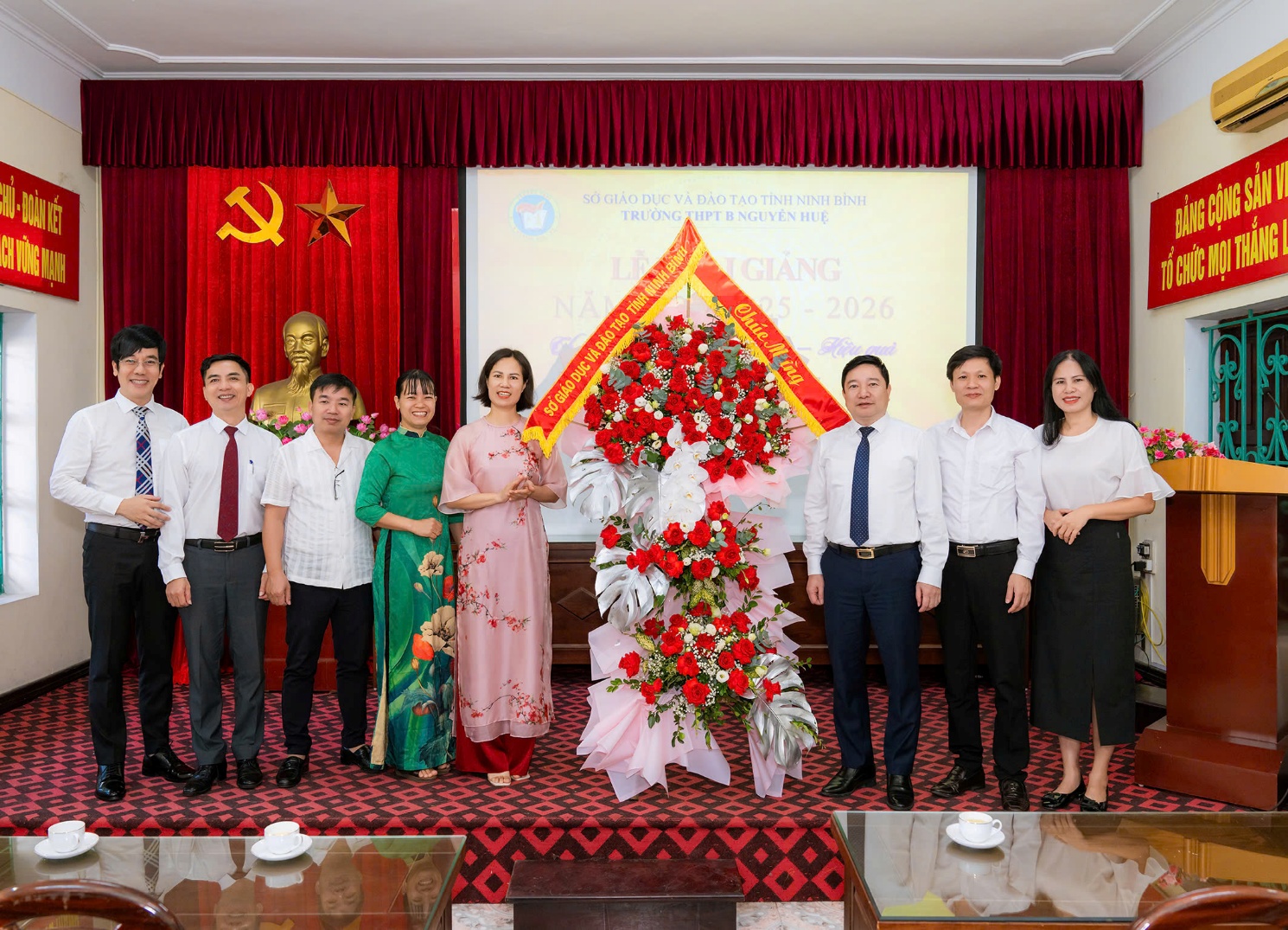Sáng ngày 04/9/2025, trong không khí hân hoan của những ngày trước thềm năm học mới, trường THPT B Nguyễn Huệ vinh dự được đón đồng chí Giám đốc Sở Giáo dục và Đào tạo (GDĐT) cùng Đoàn công tác về thăm, tặng hoa và chúc mừng thầy, trò nhà trường nhân dịp khai giảng năm học 2025 – 2026. Cùng đi với Đoàn có đồng chí Cao Văn Giáp, Trưởng phòng Giáo dục trung học và các đồng chí chuyên viên của Sở Giáo dục và Đào tạo.