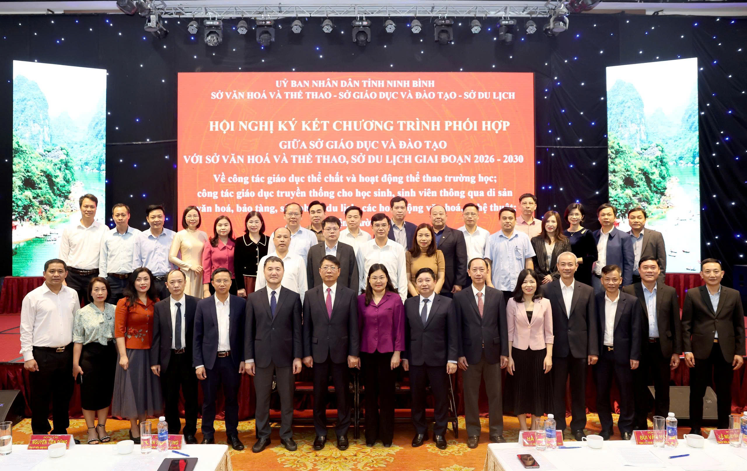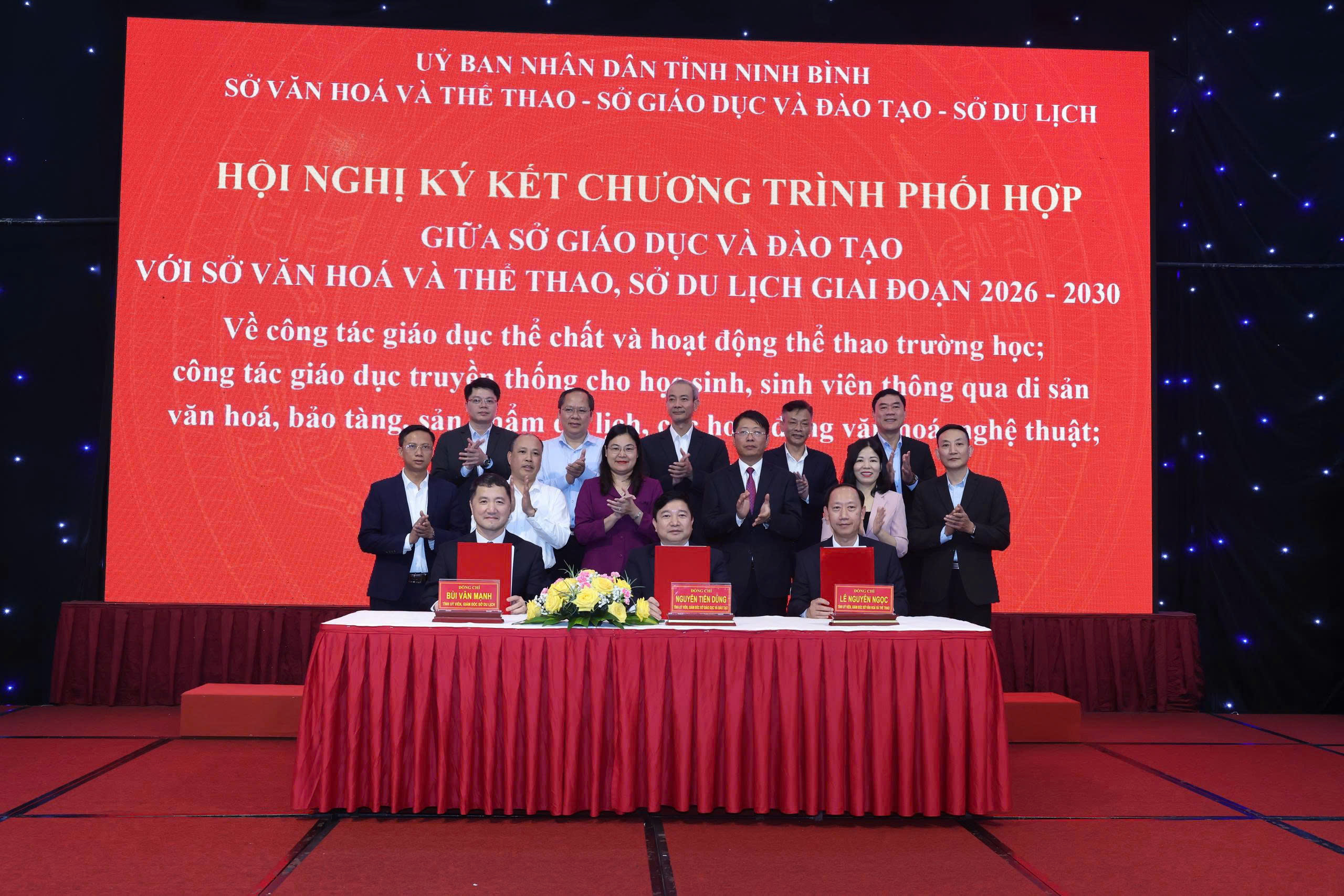 Trên cơ sở thống nhất về mục tiêu, nội dung và cơ chế phối hợp, đồng chí Nguyễn Tiến Dũng, Tỉnh ủy viên, Giám đốc Sở GDĐT, đồng chí đồng chí Lê Nguyên Ngọc, Tỉnh ủy viên, Giám đốc Sở VHTT, đồng chí đồng chí Bùi Văn Mạnh, Tỉnh ủy viên, Giám đốc Sở Du lịch đã tiến hành kí kết Chương trình phối hợp giai đoạn 2026–2030 dưới sự chứng kiến của các đ/c lãnh đạo Tỉnh ủy, UBND tỉnh và các đại biểu tham dự Hội nghị.