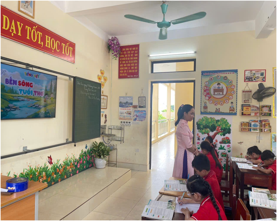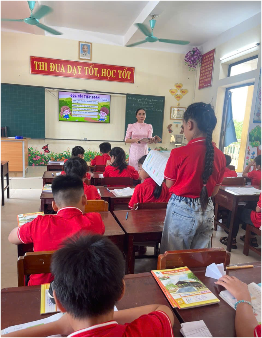 Ảnh cô Nguyễn Thị Huê thực hiện tiết dạy minh hoạ môn Tiếng Việt lớp 5