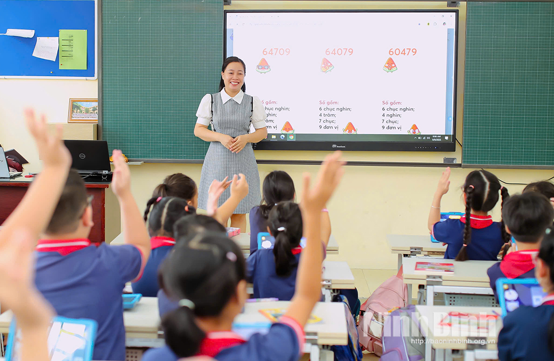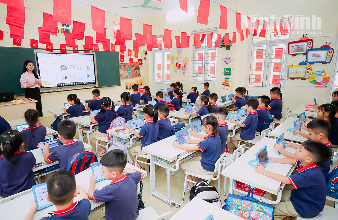 Một tiết học tại Trường Tiểu học Trần Nhân Tông với sự hỗ trợ của các thiết bị công nghệ hiện đại.