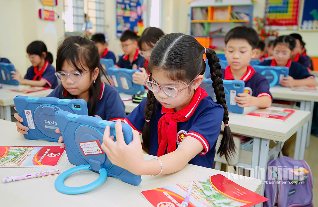 Học sinh Trường Tiểu học Trần Nhân Tông sử dụng thành thạo máy tính bảng Nexta để tra cứu thông tin và làm bài tập trực tuyến