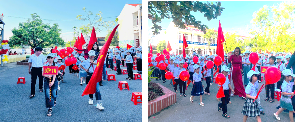 Nghi lễ đón học sinh lớp 1 diễn ra thật trang trọng. Trên tay các em là những lá cờ đỏ sao vàng, bóng bay hân hoan vẫy chào các vị đại biểu cùng các thầy cô giáo.