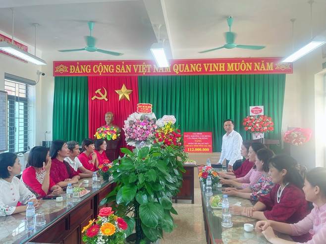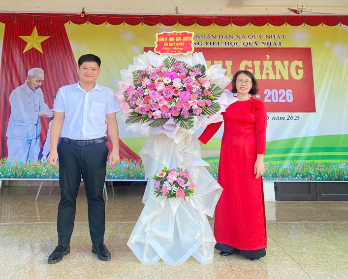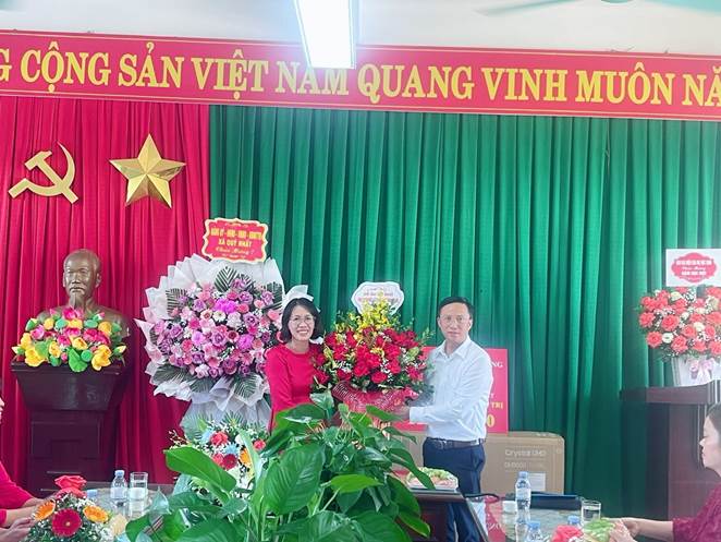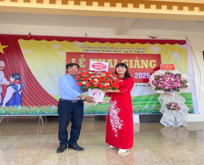 Ông Ngô Xuân Thành – Ủy viên ban thường vụ Đảng ủy – Chủ nhiệm ủy ban kiểm tra Đảng ủy xã Quỹ Nhất tặng hoa chúc mừng nhà trường
