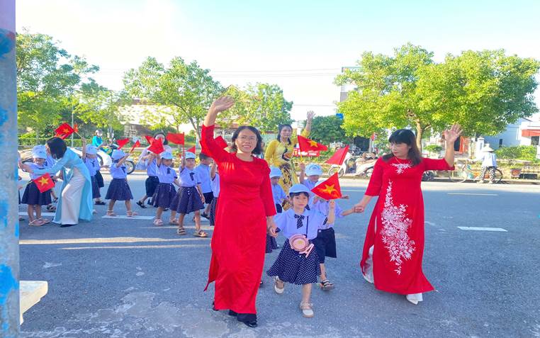 Ngay từ 6 giờ 30 phút sáng ngày 05 tháng 9 năm 2025, khuôn viên nhà trường đã ngập tràn sắc màu cờ hoa, rộn ràng trong tiếng trống, tiếng nhạc và những nụ cười rạng rỡ. Cổng trường rộng mở, hân hoan đón chào các vị đại biểu, quý phụ huynh cùng toàn thể học sinh.