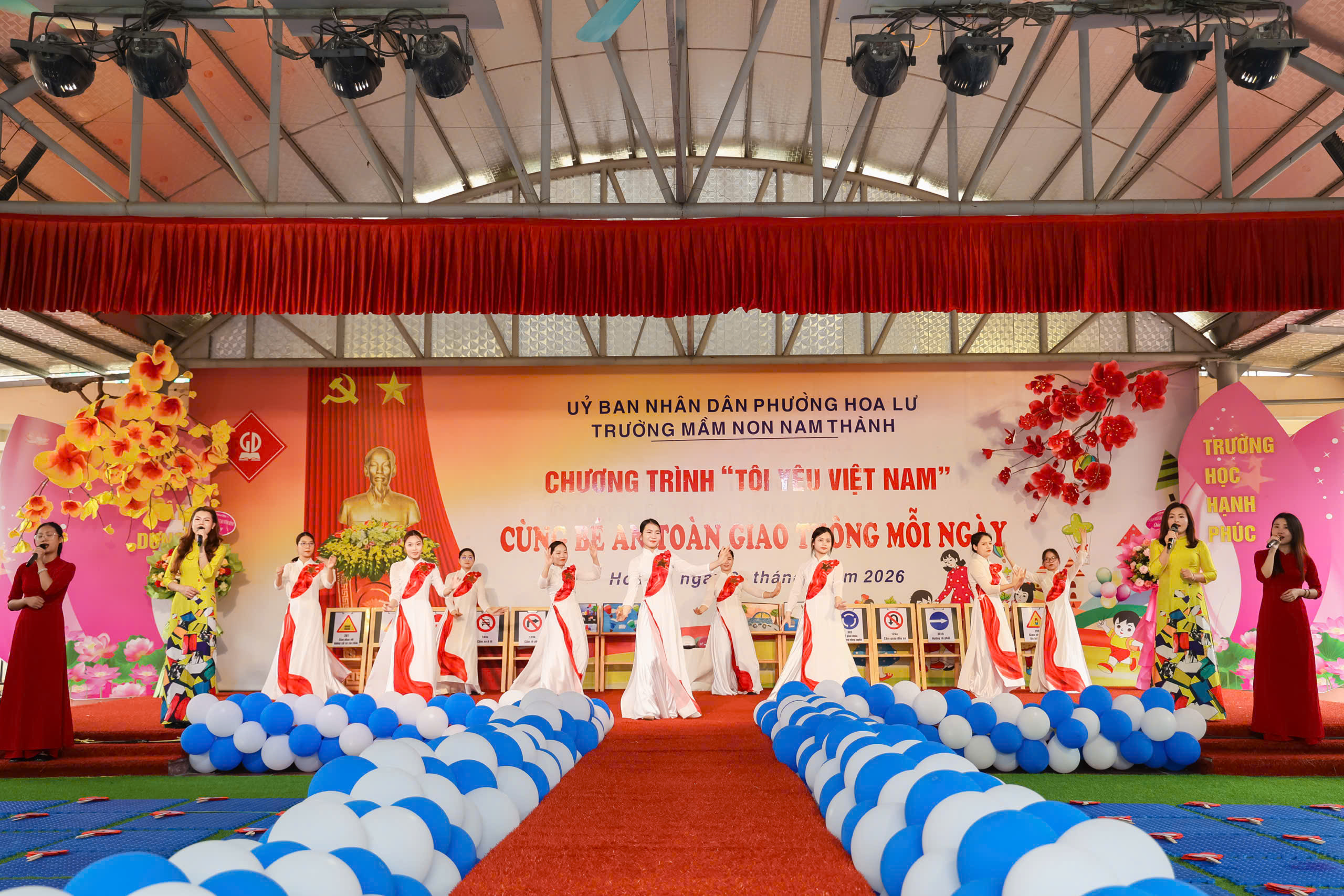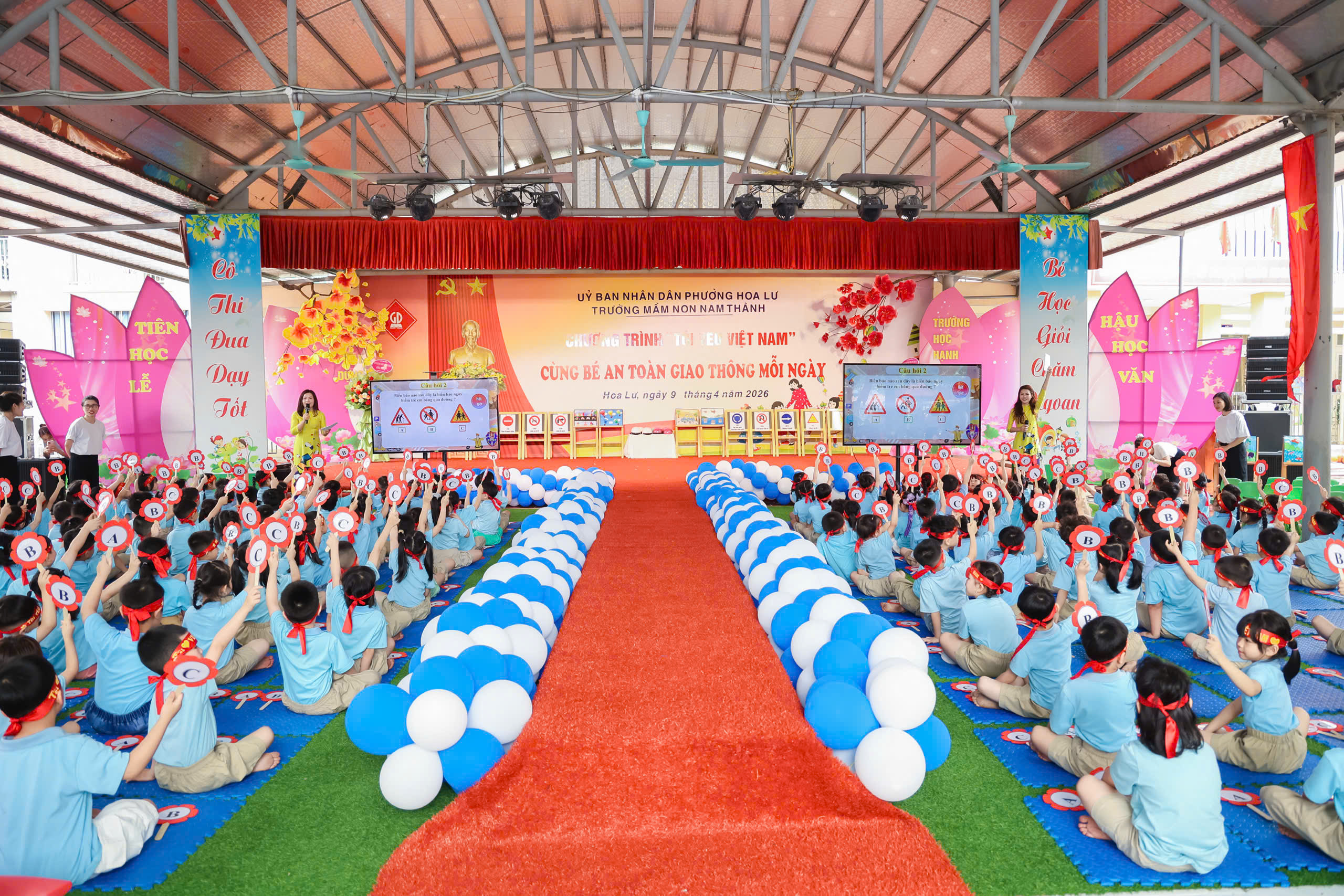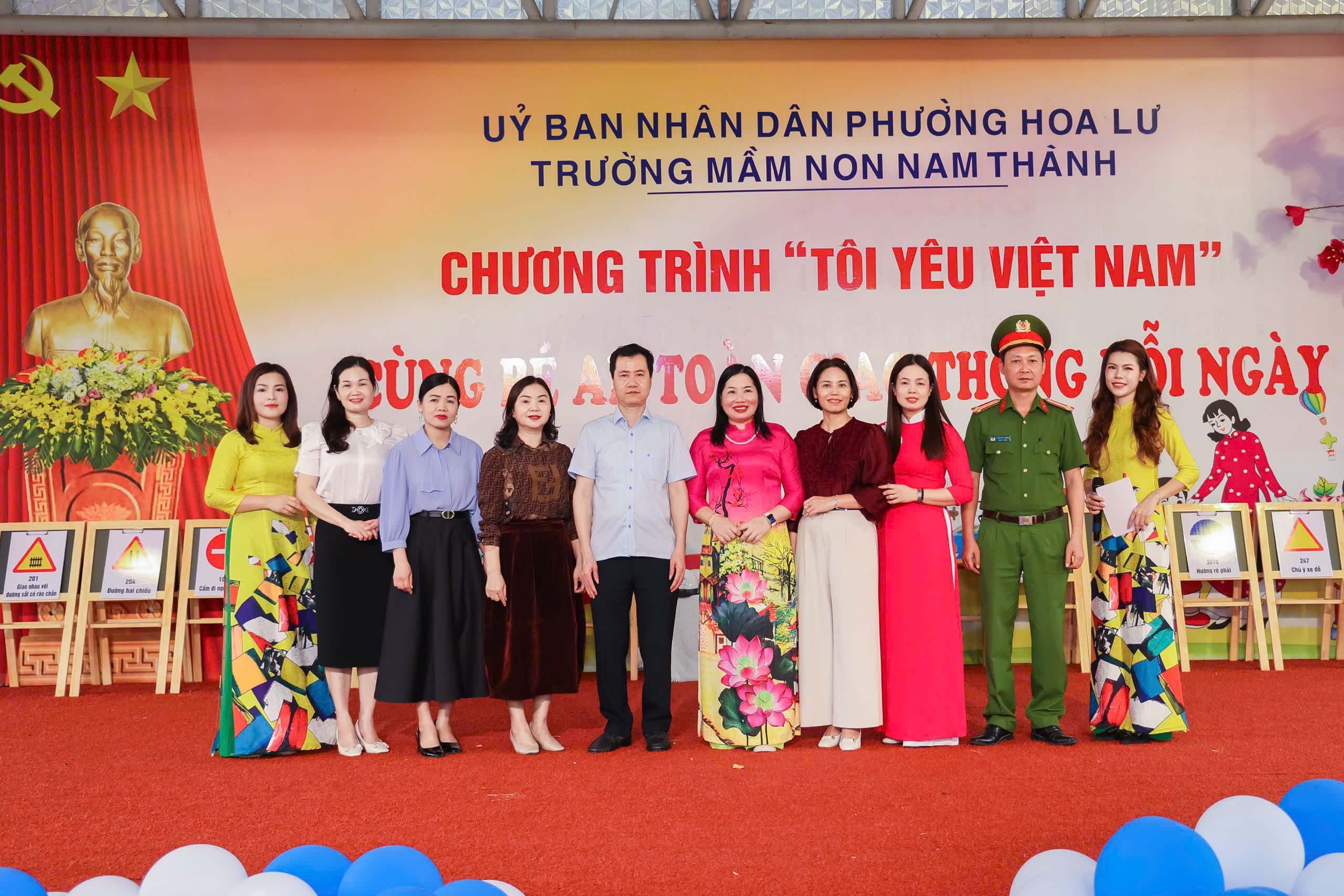 Ngày 9 tháng 4 năm 2026, trường mầm non Nam Thành phối hợp với công an phường Hoa Lư tổ chức chương trình “ Tôi yêu Việt Nam” cùng bé an toàn giao thông mỗi ngày năm học 2025-2026. Trường mầm non Nam Thành vinh dự được đón tiếp đại biểu đến tham dự chương trình: Lãnh đạo Sở GDĐT có Đ/c Ngô Xuân Hùng – Trưởng phòng GDMN Sở GDĐT tỉnh Ninh Bình; Đ/c Trịnh Thị Bản, Đ/c Lê Thị Lan – Phó trưởng phòng GDMN Sở GDĐT tỉnh Ninh Bình, cùng các đồng chí chuyên viên Sở GDĐT tỉnh Ninh Bình. Lãnh đạo UBND phường Hoa Lư có Đ/c Nguyễn Vân Anh – Phó trưởng phòng VH-XH phường Hoa Lư; Công an phường Hoa Lư có Đ/c Trần Duy Phong – Tổ phó tổ cảnh sát TT công an phường; Ban đại diện cha mẹ học sinh của nhà trường và các nhóm lớp 5 tuổi.