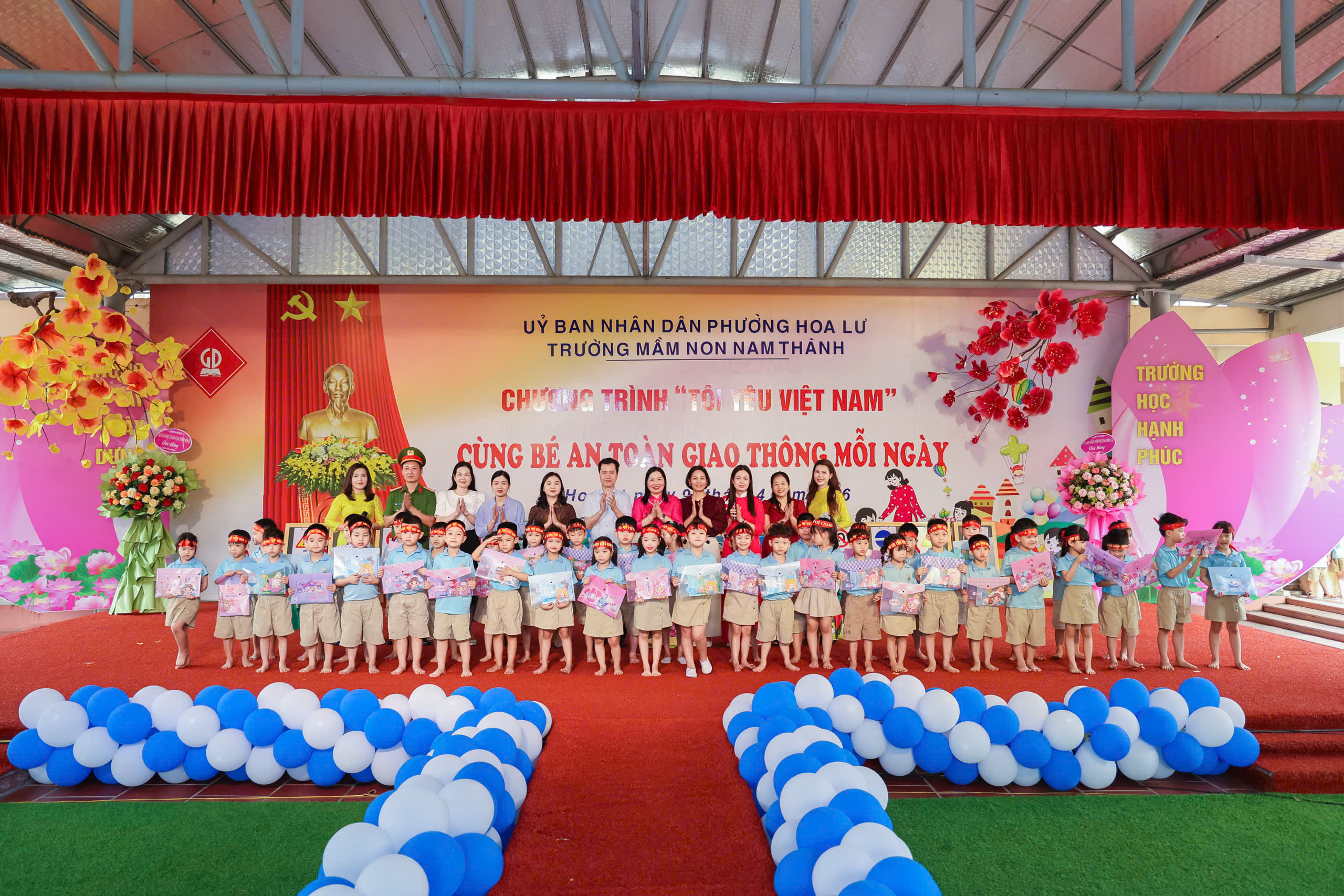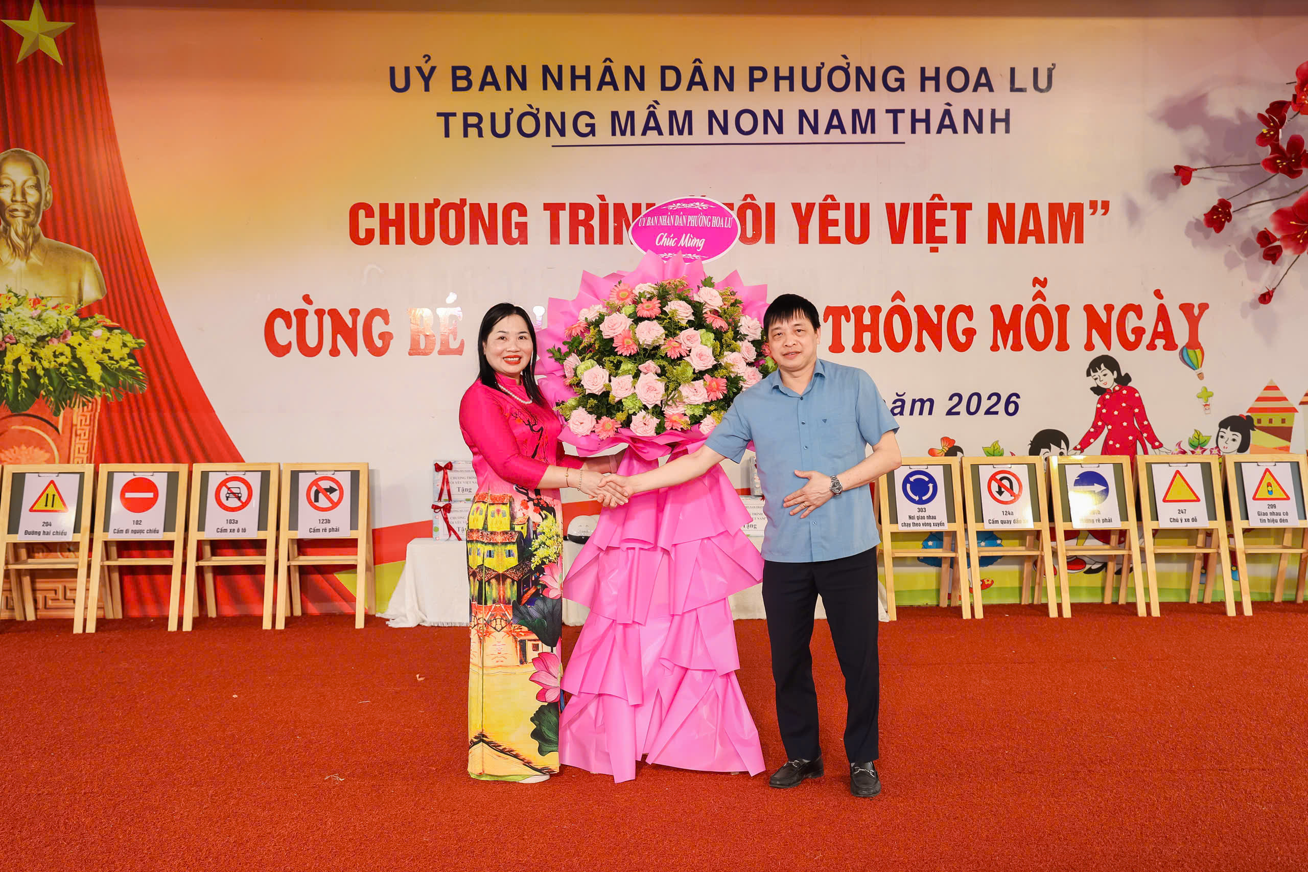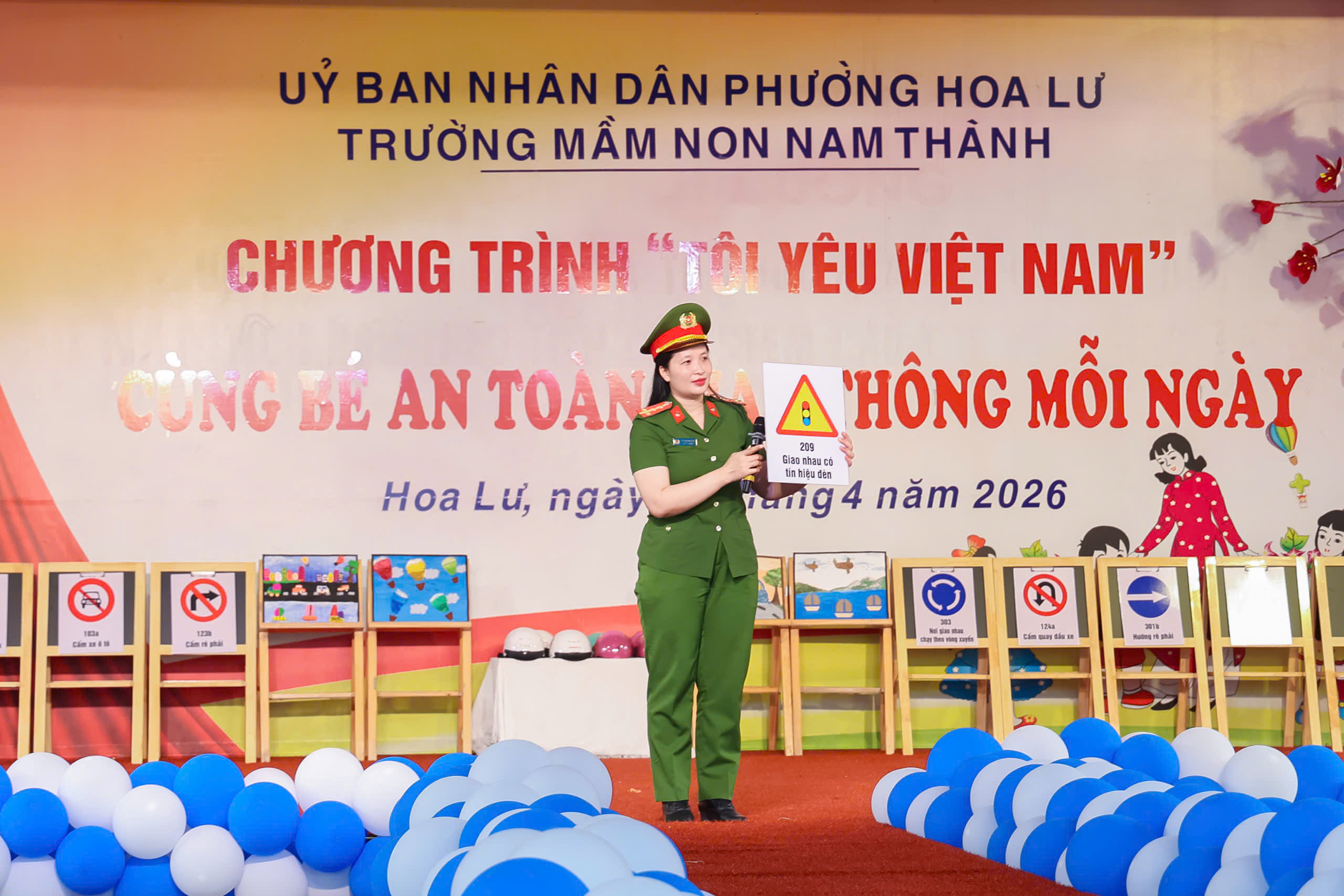 Ngày 9 tháng 4 năm 2026, trường mầm non Nam Thành phối hợp với công an phường Hoa Lư tổ chức chương trình “ Tôi yêu Việt Nam” cùng bé an toàn giao thông mỗi ngày năm học 2025-2026. Trường mầm non Nam Thành vinh dự được đón tiếp đại biểu đến tham dự chương trình: Lãnh đạo Sở GDĐT có Đ/c Ngô Xuân Hùng – Trưởng phòng GDMN Sở GDĐT tỉnh Ninh Bình; Đ/c Trịnh Thị Bản, Đ/c Lê Thị Lan – Phó trưởng phòng GDMN Sở GDĐT tỉnh Ninh Bình, cùng các đồng chí chuyên viên Sở GDĐT tỉnh Ninh Bình. Lãnh đạo UBND phường Hoa Lư có Đ/c Nguyễn Vân Anh – Phó trưởng phòng VH-XH phường Hoa Lư; Công an phường Hoa Lư có Đ/c Trần Duy Phong – Tổ phó tổ cảnh sát TT công an phường; Ban đại diện cha mẹ học sinh của nhà trường và các nhóm lớp 5 tuổi.