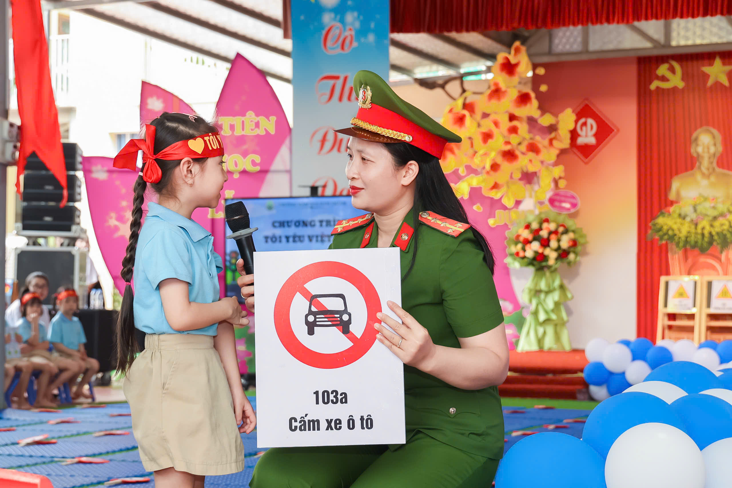 Chương trình “ Tôi yêu VN” cùng bé an toàn giao thông mỗi ngày, đã tạo ra một sân chơi lành mạnh bổ ích cho các bạn học sinh khối 5-6 tuổi với những tiết mục văn nghệ, màn trình diễn thời trang. Đại úy Lê Thị Minh Huệ cán bộ công an phường Hoa Lư lồng ghép nội dung tuyên truyền, đặt câu hỏi để trẻ trả lời, từ đó giúp trẻ hiểu biết rõ hơn về kỹ năng đi bộ an toàn trên đường phố, kỹ năng sang đường tại nơi có tín hiệu đèn, hầm, cầu vượt, …Giáo dục trẻ biết một số quy tắc tham gia giao thông với tín hiệu đèn; tìm hiểu một số nhóm biển báo cấm; biển báo nguy hiểm; hướng dẫn đội mũ bảo hiểm đúng cách. Từ những kiến thức mà trẻ được nghe qua bài truyên truyền và qua các giờ học trên lớp trẻ tiếp tục tham gia phần thi “ Tìm hiểu kiến thức an toàn giao thông” dưới hình thức “ Rung chuông vàng” rất thiết thực và sôi nổi. Phần cuối của chương trình, trẻ được trải nghiệm thực tế trên sa hình ngã tư đường phố theo tín hiệu đèn giao thông trong sân trường, dưới sự điều khiển của cảnh sát nhí Tùng Lâm lớp 5B2.