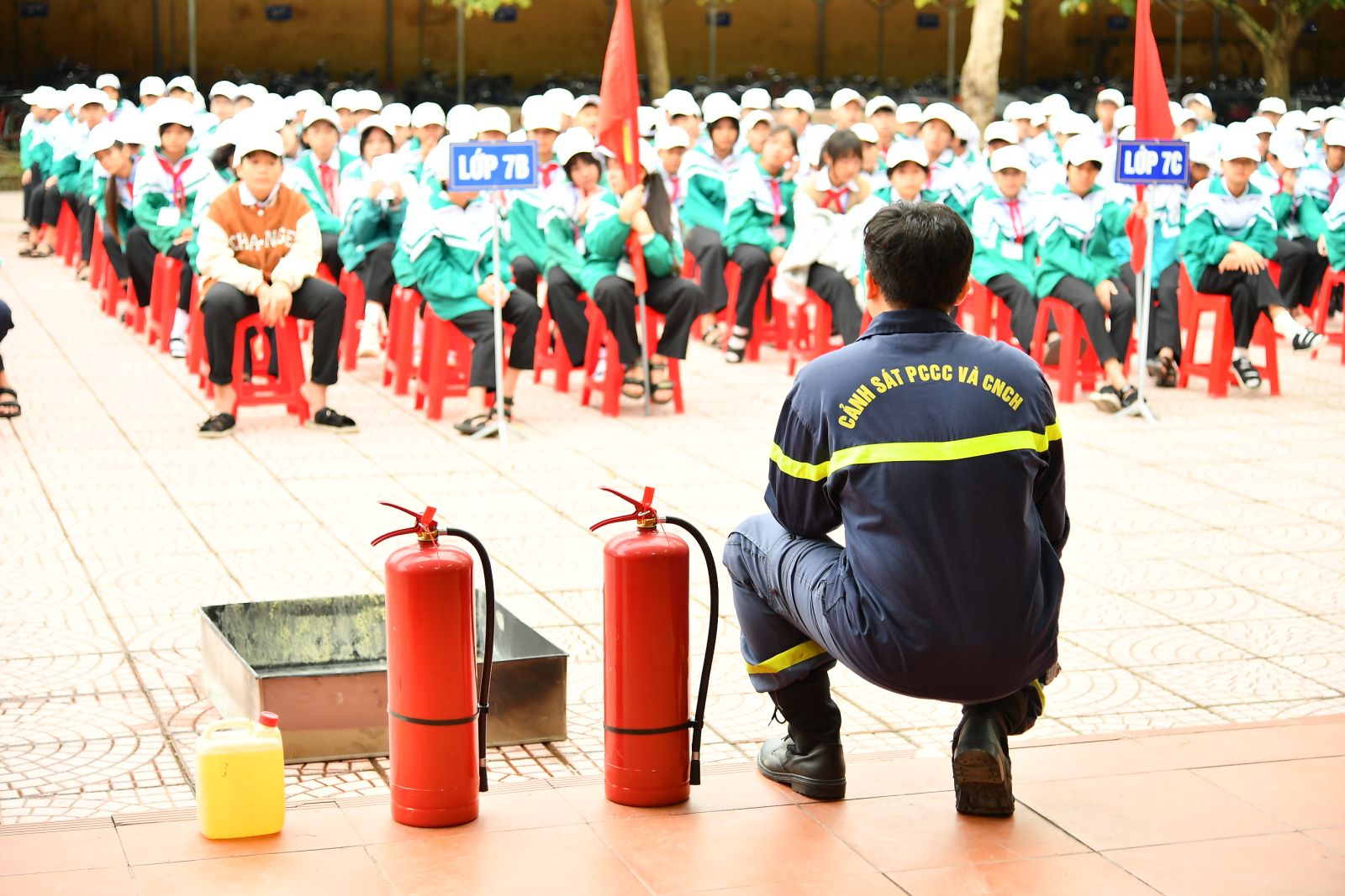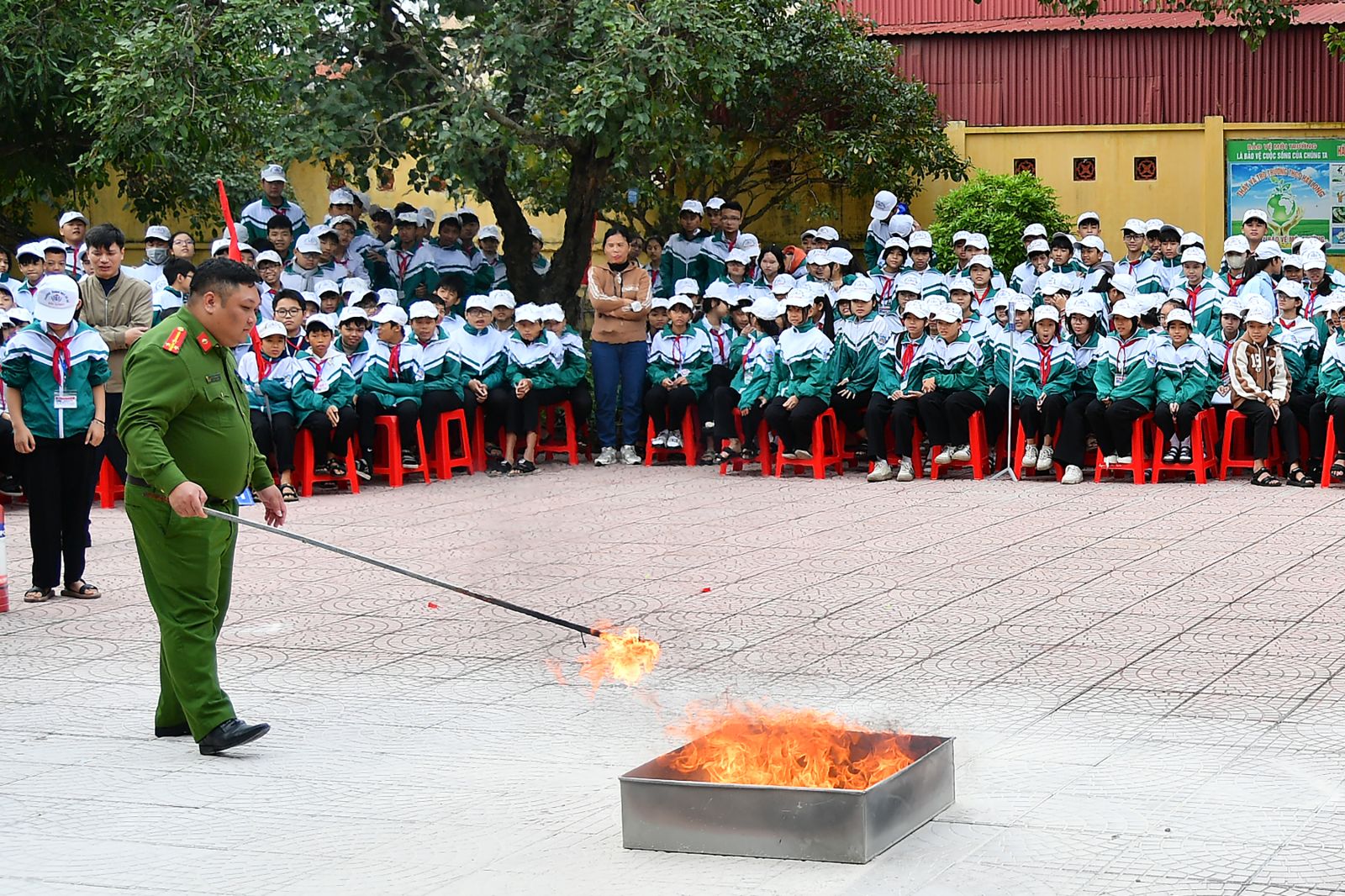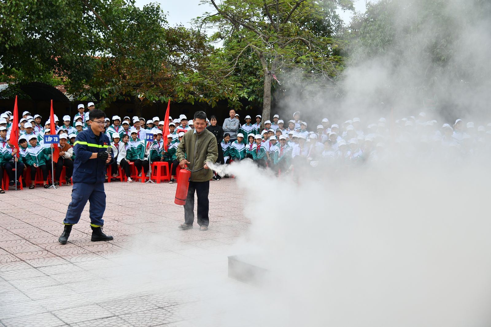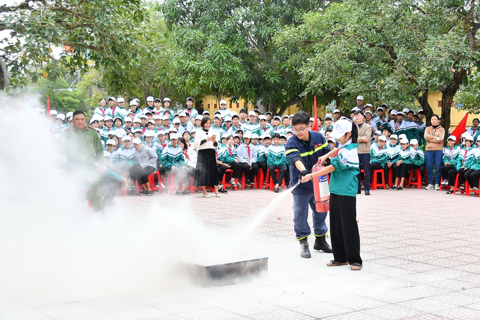 Tiếp đó, Thượng úy Nguyễn Minh Đức đã tuyên truyền và hướng dẫn thực hành Phòng cháy Chữa cháy. Với những chia sẻ sinh động, cùng phần hướng dẫn thao tác trực tiếp, anh giúp học sinh hiểu rõ hơn vai trò quan trọng của việc phòng ngừa cháy nổ, đồng thời rèn luyện kỹ năng xử lý khi có tình huống khẩn cấp. Anh Đức xúc động nói: “Điều vui nhất là nhìn thấy các em học sinh chăm chú, nghiêm túc và chủ động thực hành. Khi các em hiểu và biết cách bảo vệ mình, đó chính là thành công lớn nhất của người tuyên truyền”.