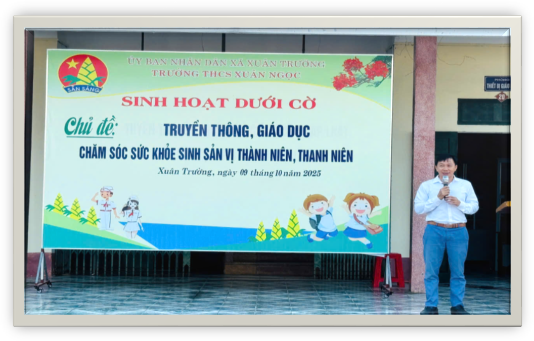 Thực hiện Công văn số 639/SGD&ĐT-GDTrH của Sở Giáo dục và Đào tạo Ninh Bình về việc phối hợp với Hội Chăm sóc Sức khoẻ Cộng đồng Việt Nam trong công tác tuyên truyền, giáo dục sức khoẻ sinh sản vị thành niên, ngày 10/9/2025, trường THCS Xuân Ngọc đã tổ chức buổi tuyên truyền, giáo dục chăm sóc sức khoẻ sinh sản vị thành niên cho toàn thể học sinh trong nhà trường. Đặng Xuân Tuấn – Chuyên viên Hội Chăm sóc Sức khoẻ Cộng đồng Việt Nam. Thầy giáo: Phạm Văn Thành, Bí thư Chi bộ, Hiệu trưởng nhà trường. Thầy giáo: Bùi Đức Tiến, Phó bí thư Chi bộ, Phó hiệu trưởng nhà trường, giáo viên chủ nhiệm và học sinh các khối lớp 6, 7, 8, 9.