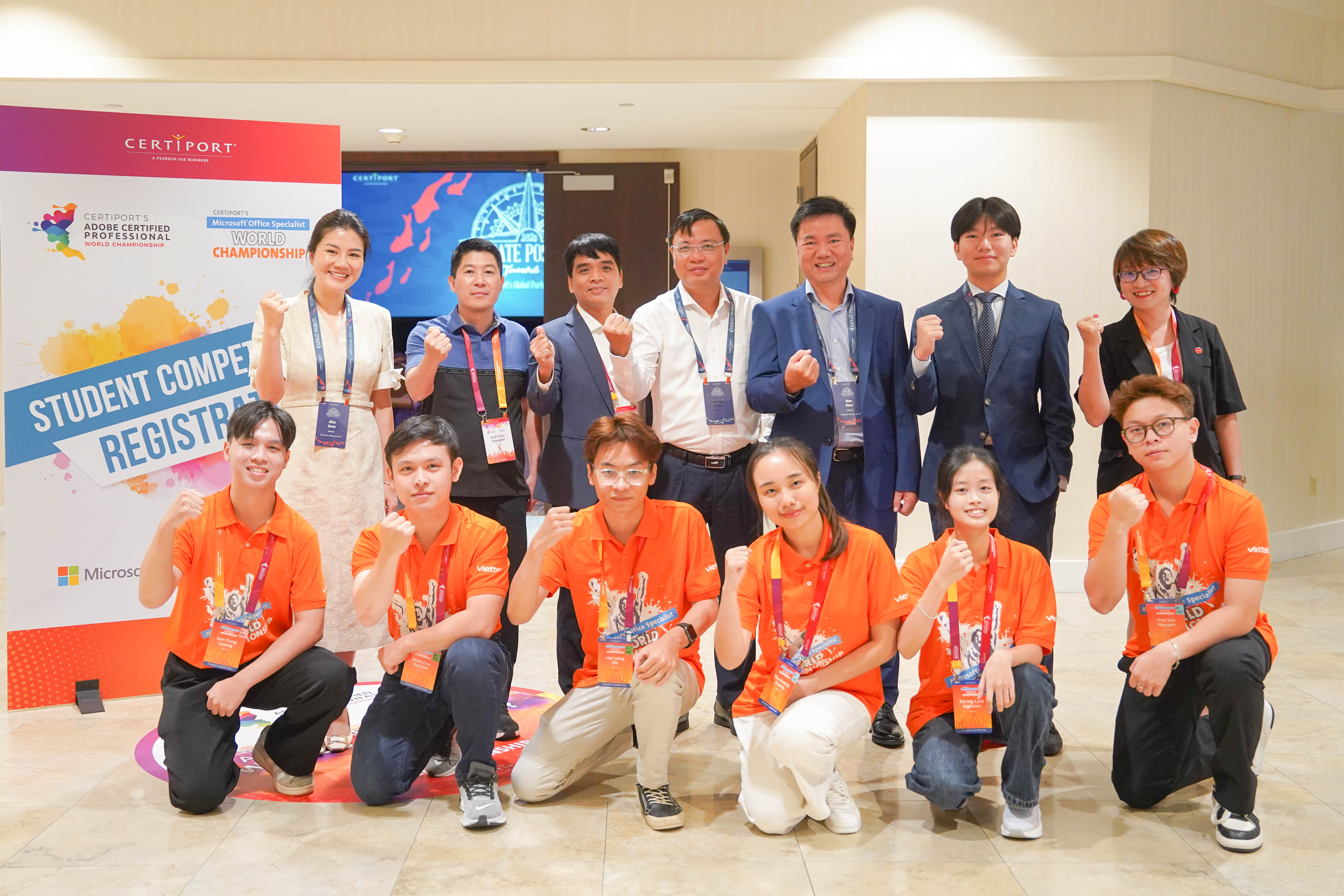Thầy Phạm Thanh Ngọc (áo trắng, đứng giữa hàng trên) và em Nguyễn Thái Sơn (góc phải hàng dưới) chụp ảnh cùng đoàn đại biểu, đội tuyển MOS Việt Nam tại vòng chung kết thế giới
