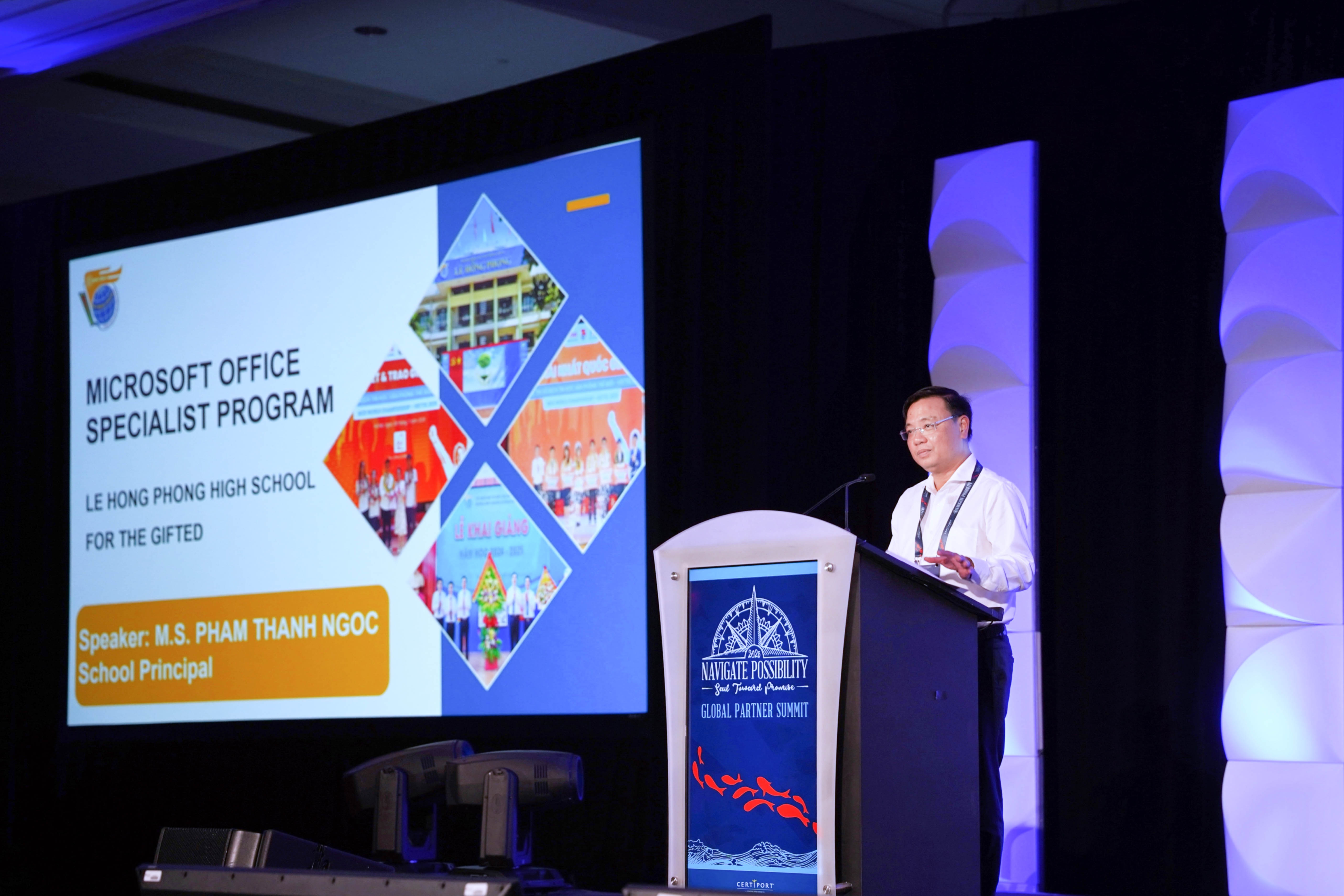 Phát biểu tại Hội nghị Đối tác Certiport Toàn cầu: Thành công cùng Chứng chỉ – Góc nhìn từ Khách hàng tổ chức tại Orlando (Mỹ), thầy Phạm Thanh Ngọc – Hiệu trưởng trường THPT Chuyên Lê Hồng Phong (Ninh Bình) khẳng định trường hướng đến mục tiêu mỗi học sinh của nhà trường khi tốt nghiệp đều sở hữu đủ bộ ba chứng chỉ MOS Word, Excel và Powerpoint.