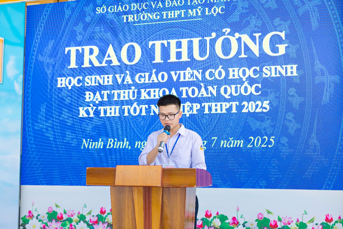 Một trong những thành tích nổi bật nhất của Trường THPT Mỹ Lộc năm nay chính là em Trần Xuân Đam, học sinh lớp 12A1, đạt Thủ khoa toàn quốc kỳ thi tốt nghiệp THPT năm 2025 với tổng số điểm 39/4 môn thi – một thành tích đặc biệt tự hào, minh chứng cho sự nỗ lực không ngừng của bản thân em, sự tận tâm của đội ngũ giáo viên và môi trường giáo dục nghiêm túc, hiệu quả.