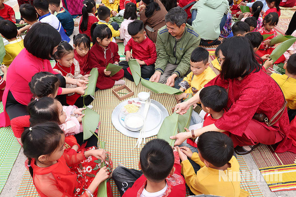 Tại chương trình, các em học sinh được trải nghiệm, hướng dẫn gói bánh chưng từ các thầy cô giáo, các bậc phụ huynh.