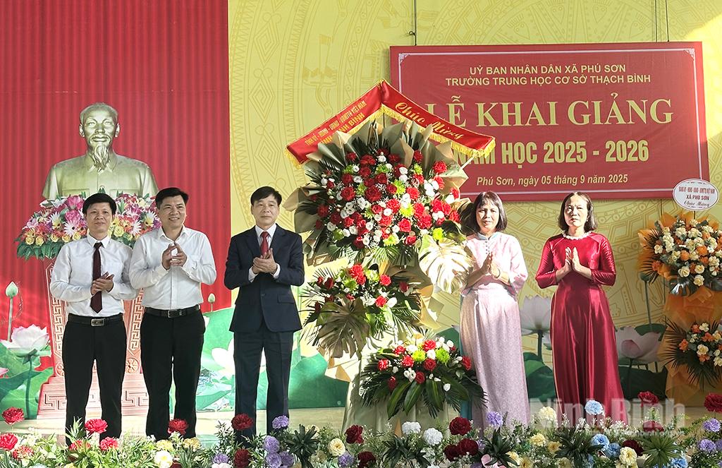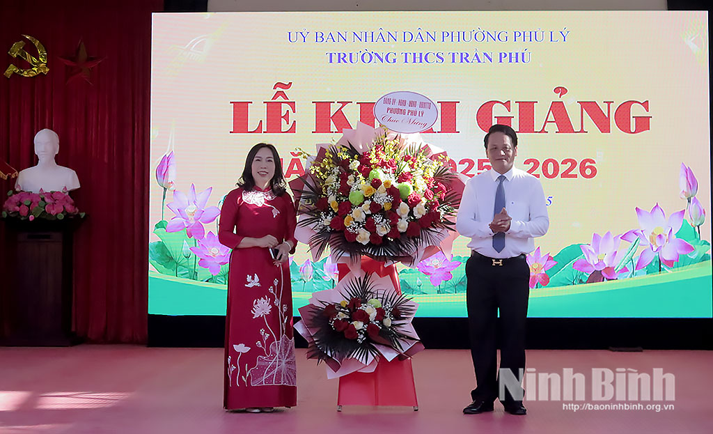 Đồng chí Đào Đình Tùng, Ủy viên Ban Thường vụ Tỉnh ủy, Bí thư Đảng ủy phường Phủ Lý tặng hoa chúc mừng thầy trò Trường THCS Trần Phú trong Lễ khai giảng năm học mới 2025 2026.