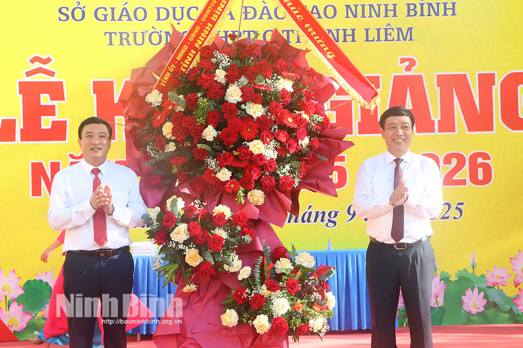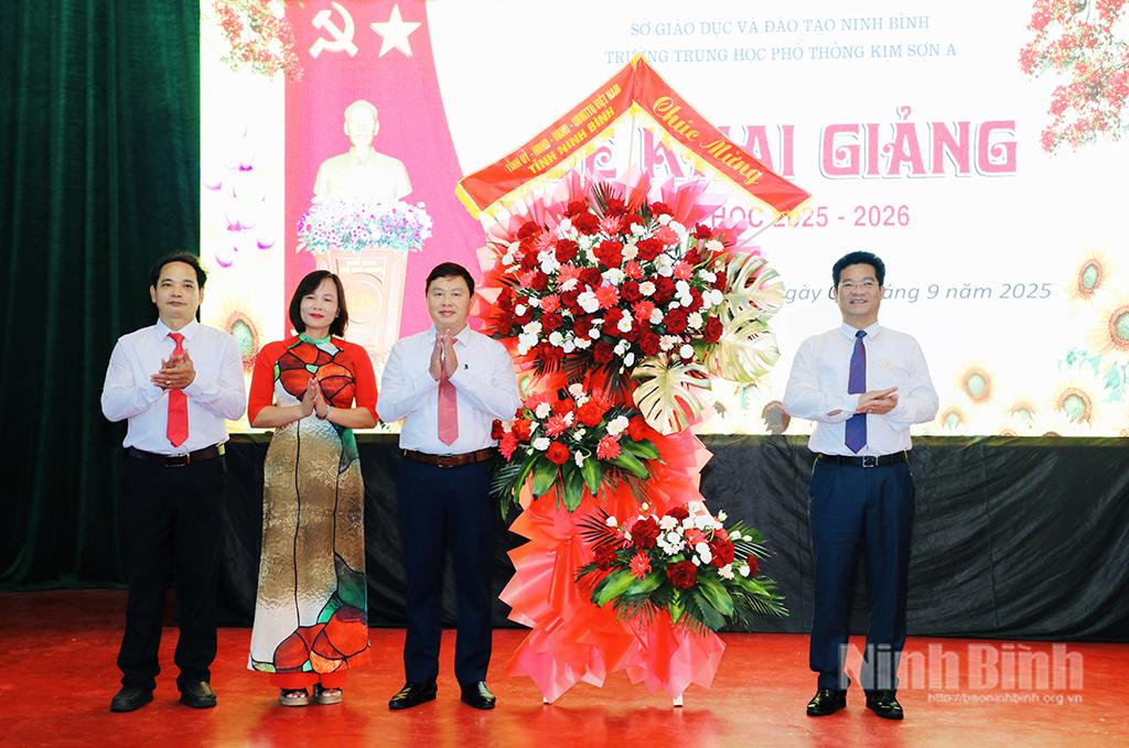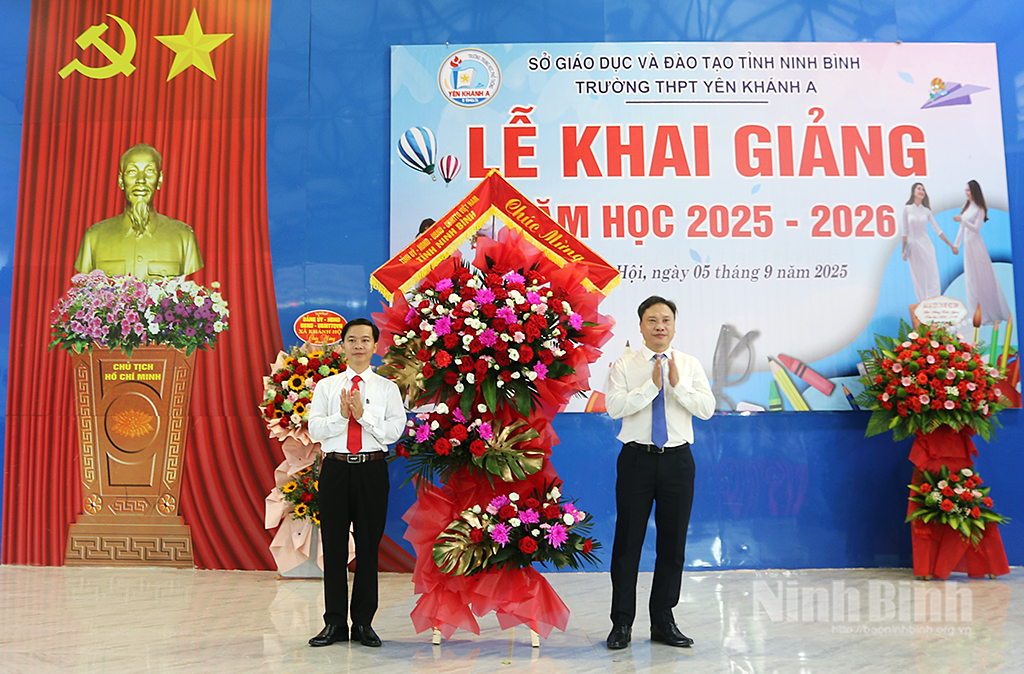 Tại lễ khai giảng, đồng chí Hoàng Nguyên Dự, Ủy viên Ban Thường vụ Tỉnh ủy, Phó Bí thư chuyên trách Đảng ủy các cơ quan Đảng tỉnh đã tặng hoa chúc mừng thày, trò Trường THPT Yên Khánh A.