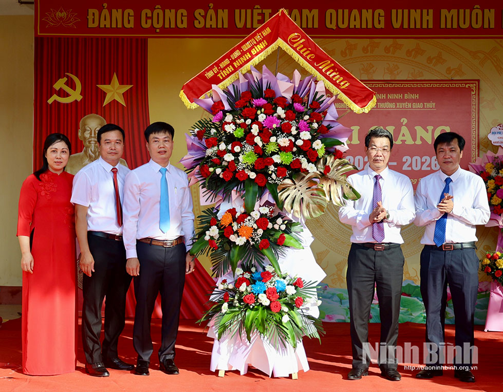 Đồng chí Hoàng Nguyên Dự, Ủy viên Ban Thường vụ Tỉnh ủy, Phó Bí thư chuyên trách Đảng ủy các cơ quan Đảng tỉnh tặng hoa chức mừng thầy và trò Trường THPT Yên Khánh A. Ảnh: Mai Phương