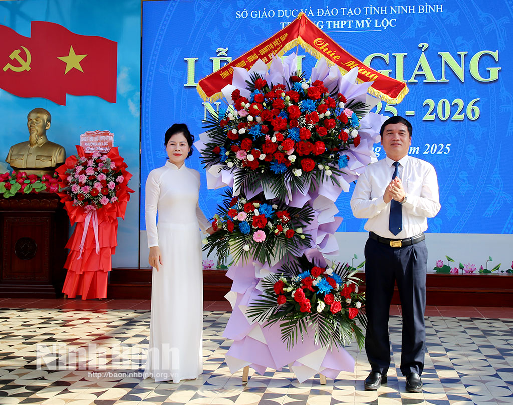 Tại buổi lễ, đồng chí Nguyễn Văn Lượng, Ủy viên Ban Thường vụ Tỉnh ủy, Giám đốc Sở Xây dựng ghi nhận, biểu dương những kết quả, thành tích, tiến bộ vượt bậc của Trường THPT Mỹ Lộc trong những năm học vừa qua. Đồng thời tặng lẵng hoa tươi thắm, chúc thầy và trò nhà trường hoàn thành xuất sắc nhiệm vụ năm học 2025-2026.