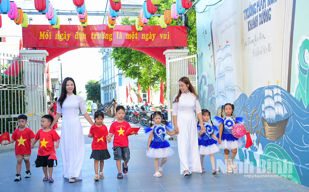 Cô giáo Trường Mầm non Khánh Dương, xã Yên Mô đón học sinh đến trường trong ngày khai giảng năm học mới.