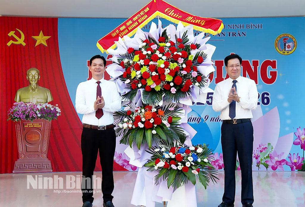 Đồng chí Phạm Duy Hưng, Ủy viên Ban Thường vụ Tỉnh ủy, Chánh Văn phòng Tỉnh ủy tặng hoa chúc mừng thầy và trò Trung tâm Giáo dục Nghề nghiệp – Giáo dục Thường xuyên Yên Khánh. Ảnh: Minh Đường