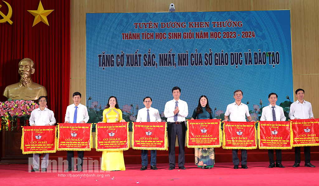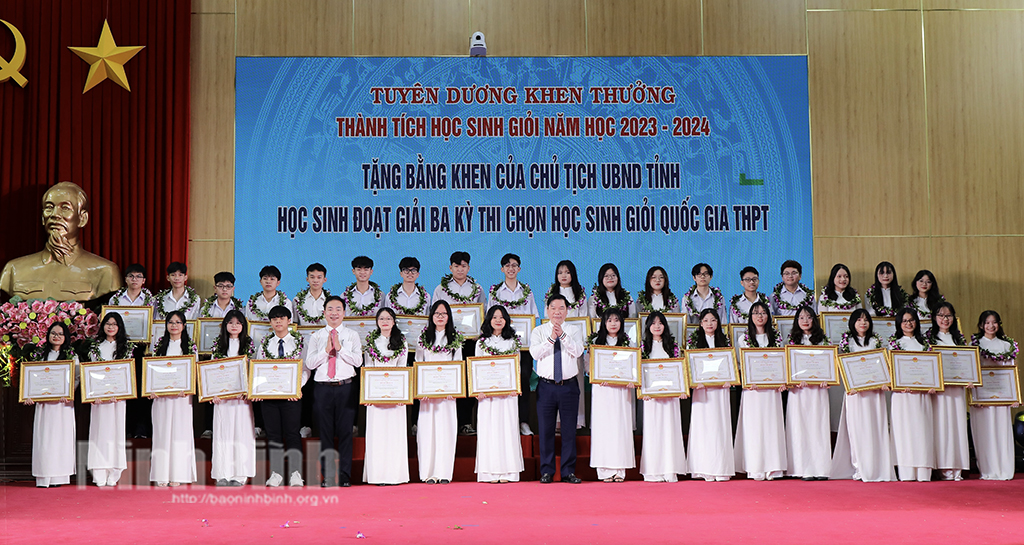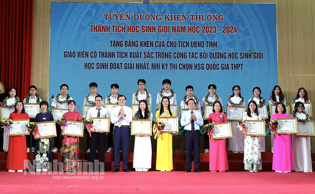 Trong đó, theo Nghị quyết số 37, ngày 29/7/2021 của HĐND tỉnh về việc ban hành Quy định chính sách khuyến khích tài năng trên địa bàn tỉnh Ninh Bình, các em học sinh đoạt giải và giáo viên trực tiếp tập huấn, bồi dưỡng học sinh đoạt giải trong Kỳ thi chọn HSG quốc gia THPT năm học 2023-2024 được thưởng trên 2,3 tỷ đồng; Chủ tịch UBND tỉnh tặng Bằng khen cho 50 học sinh đoạt giải Nhất, Nhì, Ba trong Kỳ thi chọn HSG quốc gia THPT và 8 giáo viên có thành tích xuất sắc trong công tác bồi dưỡng HSG năm học 2023-2024. Giám đốc Sở GD&ĐT tặng Cờ cho 20 tập thể; giấy khen cho 45 giáo viên và 1.535 lượt học sinh, học viên.